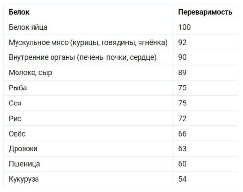Вот данные по переваримости белка из различных продуктов, у собак, рассчитанные по общепринятой стобалльной системе. Высший балл — 100 — присваивается продукту, который обладает самой высокой усвояемостью.